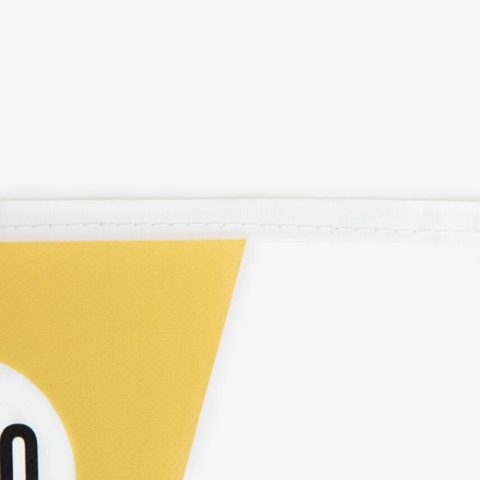 Op zoek naar een feestelijke én doelgerichte manier om jouw boodschap zichtbaar te maken? De vlaggenlijn is ideaal voor promoties, evenementen of bedrijfsacties. Dankzij de puntvlaggetjes aan een sterke band trekt je boodschap de aandacht zonder massieve constructies. Je hebt de keuze uit enkel- of dubbelzijdige bedrukking. De vlaggenlijn is 5 meter lang en bestaat uit 13 puntvlaggetjes, met 10 cm tussenruimte tussen de vlaggetjes. Beide uiteinden hebben 50 cm extra band, zodat je de lijn eenvoudig kunt bevestigen. Voor de afwerking kun je kiezen uit band in wit of zwart, afhankelijk van je design en voorkeur.